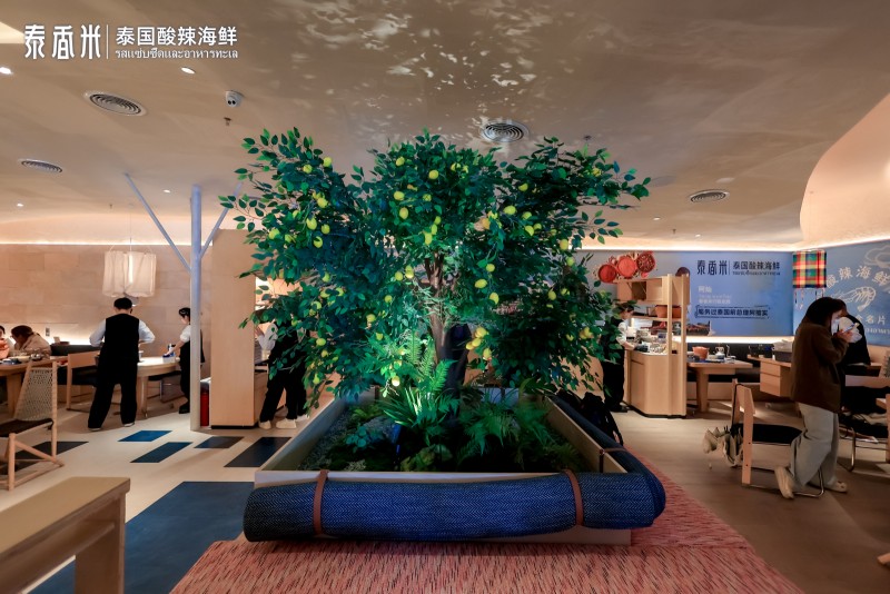 泰香米综合考虑顾客需求、品牌发展方向以及商圈竞争优势,以“城市绿岛”概念设计开放式厨房岛台,冻鲜食材展示区,室内柠檬树花园,营造现代都市人品味自然的放松空间。